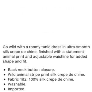 Go wild with this gorgeous roomy tunic dress in ultra-smooth silk crepe de chine, adjustable waistline for added shape and fit, washable.