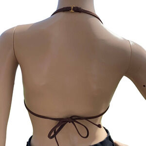 This Nicolita Moroccan halter bikini top is brand new with tags and in excellent condition. Its rich brown hue, twisted front and pleated detailing evoke resort-ready sophistication, while the backless tie closure and gold-tone hardware add a touch of luxe flair.
