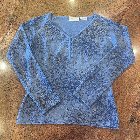 Nieman Marcus Cashmere Collection Blue Floral Sweater Size Small. Excellent Condition. 100% cashmere! Button Embellishments! Free of odors, stains, pulls, pilling, holes or any other flaws.