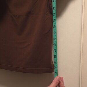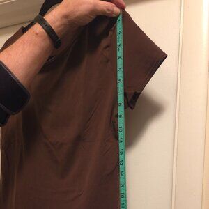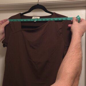 Brown short-sleeve top, with an asymmetric neckline.