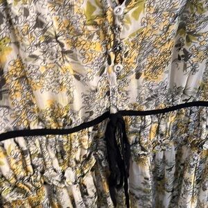 Secret Mission "Benazir" silk crinkle chiffon dress in a yellow romantic ditzy floral print features an easy pleated silhouette with contrasting black velvet tie and gathered waist details with delicate ruffle trims.