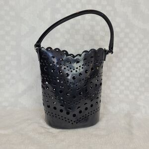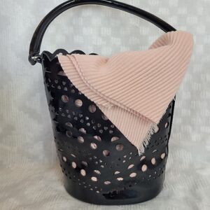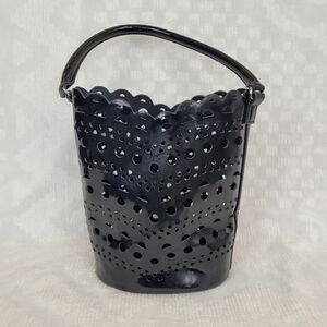 Nieman Marcus faux patent leather black bucket bag scallop detail cutouts artsy