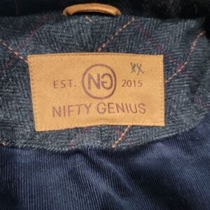 nifty genius charcoal colored wool blend two button blazer sports coat lined with navy corduroy. pre owned no rips or stains. has marker on tag
