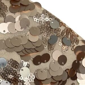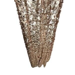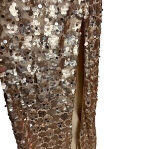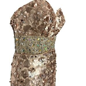 This is a stunning Night Moves formal gown in a light gold color, featuring all-over sequins and intricate beading for a glamorous look. The dress is sleeveless with a strapless design and a side slit detail, perfect for a wedding or formal occasion. Made of polyester material, this sheath-style dress has a long length and a zipper closure for easy wear. This elegant gown is size 4 and should be dry cleaned only.