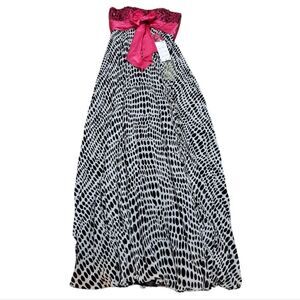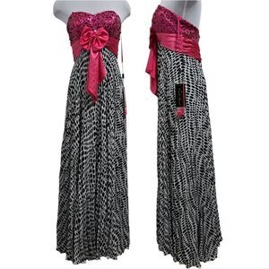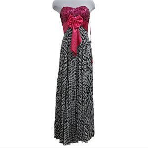 Night Moves Strapless Polka-Dot Formal Maxi Dress Front Bow Tie Size 8 Fuschia Black/White NWT