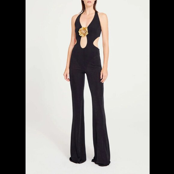 Elevate your wardrobe with this chic black jumpsuit, highlighted by a vibrant gold floral detail. Perfect for making a stylish statement. Open back. Halter neckline.