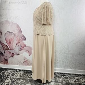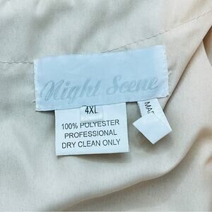 This Night Scene beaded mother of the bride or groom dress in a classic cream color exudes elegance and sophistication. The dress features a beautifully beaded bodice, with all beads intact, adding a touch of sparkle. The flowing skirt creates a graceful silhouette, while the short sleeves and waistband are delicately scalloped for a refined look. Light shoulder pads provide structure, and the dress is fully lined for comfort. With no stretch, this maxi-length dress offers a timeless, polished fit. In size 4XL, it is perfect for formal occasions, making a memorable statement at weddings or other special events.