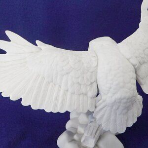 Lovely Snowy Owl figurine, wings spread and perched on a twisted tree trunk. Crafted from smooth white bisque porcelain with lifelike details. A striking decorative or collectible piece.