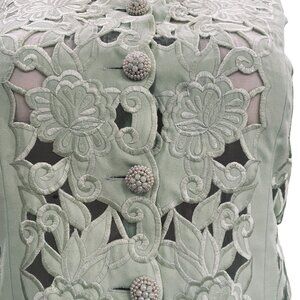Elegant and feminine, this Night Studio Couture sheer lace blazer in a soft mint green is the perfect statement piece for formal occasions. Featuring pearl beaded buttons, floral embroidered cutout lace, and scalloped edges, it’s ideal for weddings, brunches, or Sunday church.