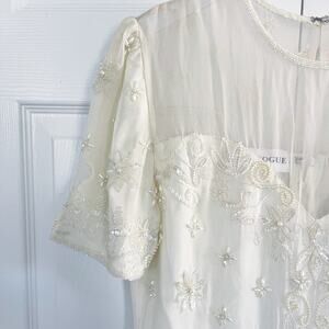 vintage glam, art deco, bridal chic, Gatsby style, 20s inspired, flapper vibes, romantic elegance, old Hollywood, cocktail hour, holiday soirée, special occasion, feminine, pearlcore, sheer detailing, delicate beading, short sleeve dress, silk dress, beaded mini dress, ivory formal dress, vintage deadstock, vintage bridal, vintage wedding dress