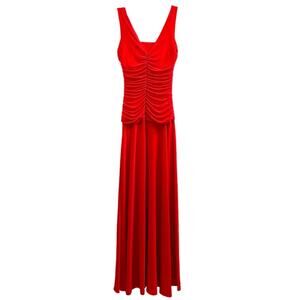 Night Way brand floor length gown. Sleeveless. Bodice has shirred sides & down the back that give a draped effect. Modified cowl neckline that keeps you covered. Beautiful bright coral color that is almost neon. Flowing skirt portion. Polyester spandex material. Top is lined. Says hand wash but gentle cycle is fine too. Great used condition. Has a small pen mark on back that should come out. Pin sized snag on side front of skirt. Hem looks altered to me. Small snag on hem too. See closeups. Size 8 but can fit a 10 also. Make a reasonable offer. Or browse & message for a great bundle deal!