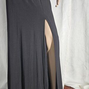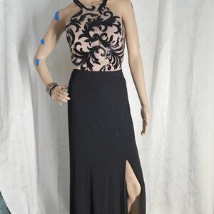 Elegant prom dress with a black lace overlay on a cream bodice. Features a sleek black skirt with a side slit. Perfect for formal occasions.