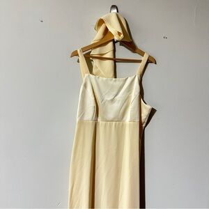 Elegant vintage-inspired cream maxi dress by Night Way Collections, made in the USA. Features a satin-finish bodice with wide straps, a flowing chiffon skirt, and a modest square neckline. Fully lined for comfort with a back zipper closure. Perfect for weddings, formal events, or evening occasions.