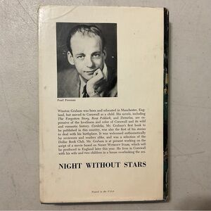 Night Without Stars by Winston Graham. This is a hardcover book. It was published by Doubleday in 1950. This book has 275 pages. It is approximately 8 1/2” long x 5 3/4” wide x 1” thick. This book is in great vintage condition. Binding is in great shape, slight wear to the dust cover, no writing in the book, no torn pages, no discoloration to the pages. Smoke free home.