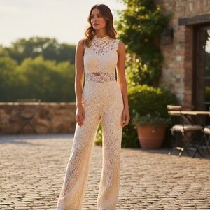 Showstopping designer jumpsuit that pairs a sheer-lace bustier bodice and flowy wide-leg satin pants. vampire, goth, halloween, whimsygoth, retro 70s vibes. Perfect for cocktail parties, weddings, night out, date night, black tie, special occasion, new years, holiday parties.