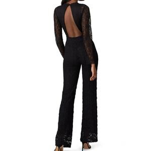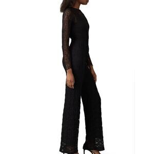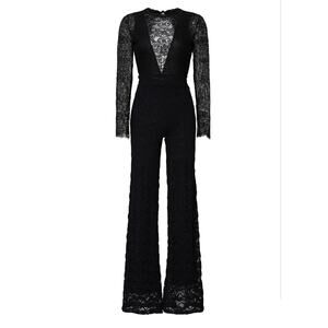 Black lace (89% Polyamide, 8% Elastane, 3% Viscose). Jumpsuit. Long sleeves. V-neckline. Hidden back zipper closure. Partially lined
