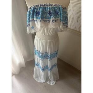 Nightcap Women’s Large White Greek Isle Embroidered Off Shoulder Flowy Maxi Dress