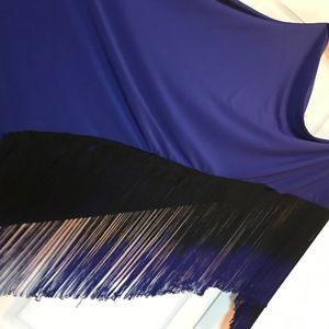 One Shoulder, ling sleeved cocktail dress with two tone fringes black and royal blue from shoulder to hem.