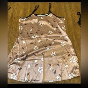 Lot of four satin cami tops. Teal cami with cream floral print. Rose-pink cami with white floral accents. Brown cami with abstract white print. Black cami with moon and star print. Lightweight silky fabric. Delicate straps. Great for layering or sleepwear.