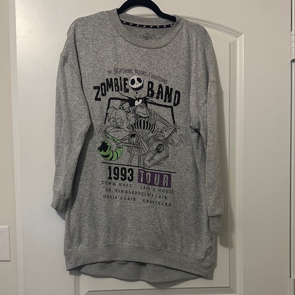 Cozy gray sweatshirt featuring The Nightmare Before Christmas design. Perfect for fans of the classic movie.