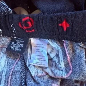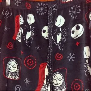 Cozy black pajama pants featuring red and white Jack Skellington and Sally graphics. Soft fabric for comfortable sleep and play. Elastic waistband with drawstring for an easy, adjustable fit.