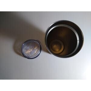 1- Stainless steel tumbler made by Ningbo China. Size is 6.25" tall. Has plastic snap on lid. Nice condition.