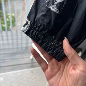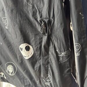 New Jack Skellington windbreaker with light water resistance, super cute pattern all over extra wide hood to protect from light rain, cinched sleeves, fully zippered pockets. One of the pockets turns over and makes it into a packable jacket that fits into the palm of your hand truly a great jacket.