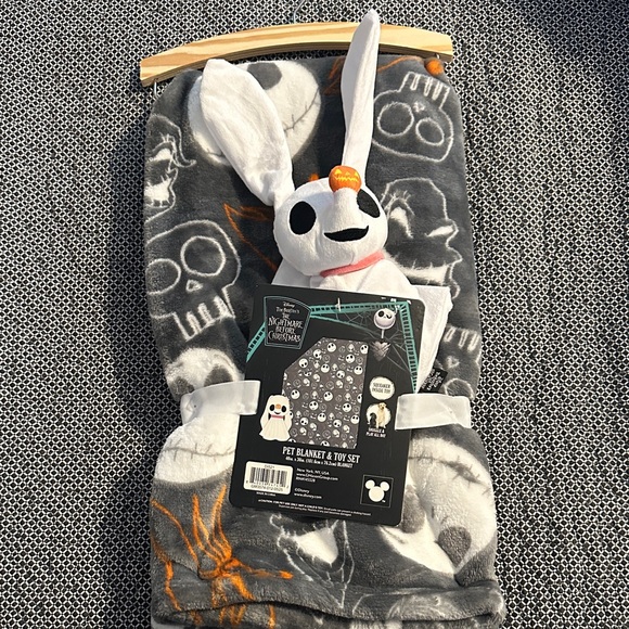 Cozy pet blanket and toy set featuring Nightmare Before Christmas design. Includes a plush toy with a character theme. Perfect for fans.