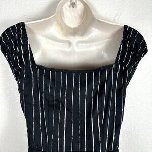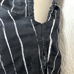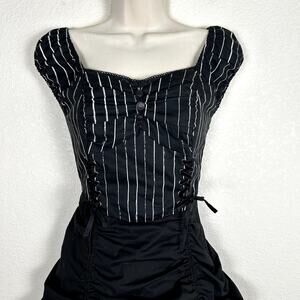 Gently used black and white cotton dress with velvet laces. Skirt is adjustable with ruched skirt laces that allow the top layer of the skirt to be longer or shorter. The under layer has a ruffle with the characters image in an overall pattern, with a lining of black tule.