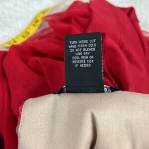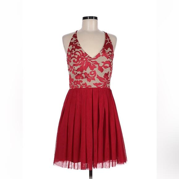 This fit and flare dress features flirty embroidered mesh bodice with veed neckline and mesh overlay pleated skirt. Low scoop back with zipper, lightly lined cups, and adjustable ribbon spaghetti straps. Not much for stretch.