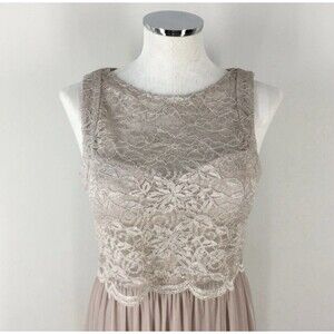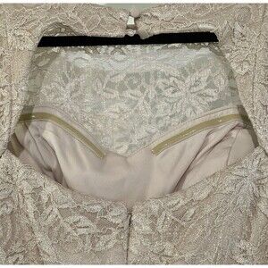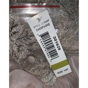 Be the belle of the ball in this stunning Nightway Champagne Lace Formal Empire Evening Stunning Prom Dress Gown in size 14P. The sleeveless ball gown features a lace pattern and is adorned with a button closure, making it perfect for a party, cocktail event, or even a wedding. The long dress length adds a touch of elegance and the sparkling champagne color is sure to turn heads.