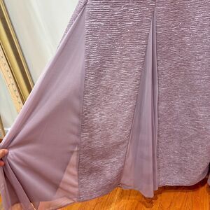 Features: Nightway Lilac Purple Shimmer Maxi Evening Dress. Keyhole Halter Neckline. Mermaid Tulle Hem. Full length, great drape.