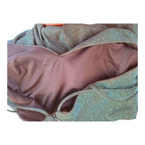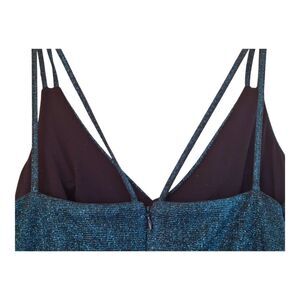 New with Tags, Floor length formal glittery shimmery evening gown, built in bra cups, front slit, flattering ruched bodice, spaghetti straps. Length measures approx. 56 inches; pit to pit approx. 18.25 inches - fabric is stretchy. Sparkly metallic threads, vivid teal blue color with navy blue lining. Assigned color is "Azure". Hidden Zip closure up the back.