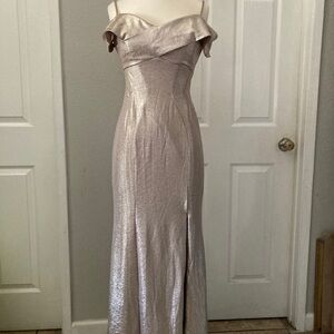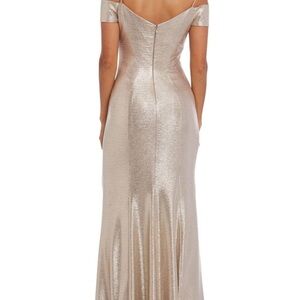 Shine in this elegant off-shoulder silver evening gown. Perfect for special occasions, this dress offers a sophisticated and glamorous look.