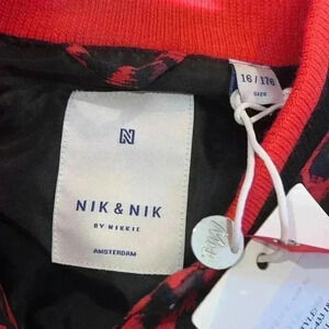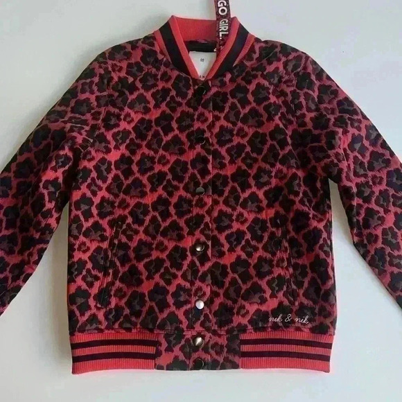 Nik & Nik girl’s red leopard print baseball style jacket. NWT. Girl’s size 16 or 1176 cm. Snaps down front. Armpit to armpit measures approx. 17”. Listing is for Jacket ONLY. See my other listings for matching shorts. Non-smoking home.