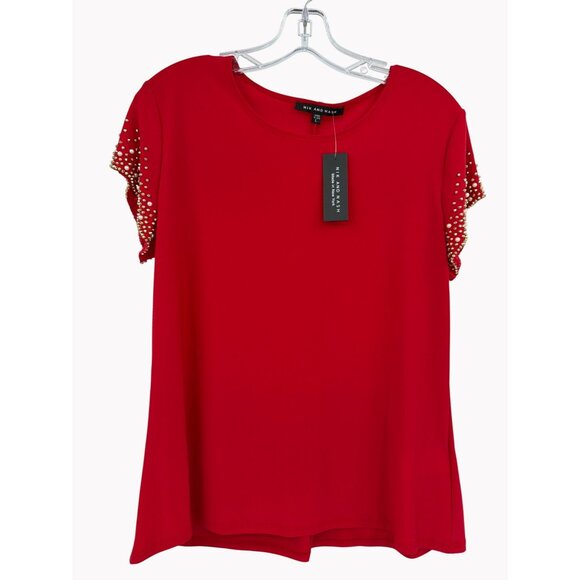 Nik and Nash Size L Red Top Gold Pearl Embellished Sleeves Womens New