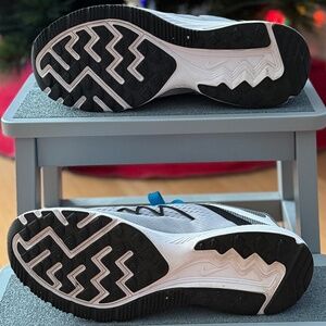 GUC. Gently used. Colors: Light gray, charcoal gray, black, white. Blue laces. Lightweight. Upper mesh construction. CUSHLON sole with good tread and life remaining.