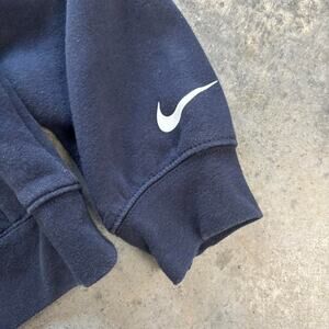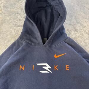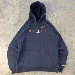 navy hoodie, oversized, embroidered logo, pullover, urban style, casual wear, fleece fabric, long sleeves, sporty, streetwear