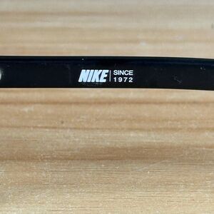 Nike 5535 eyeglass frames feature a sleek rectangular full-rim design in dark gray/black plastic. With 130mm temples, grip tips, and Nikes Just Do It slogan on the inside arms, these unisex frames deliver sporty style and everyday comfort.