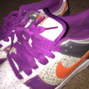 These barely worn purple, orange, white, silver Nike Sneakers are very comfortable, fashionable, and are a great buy😊