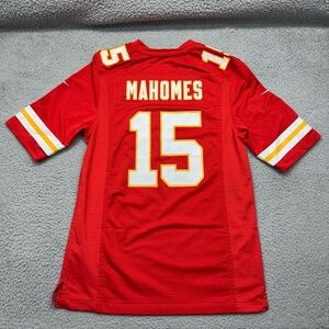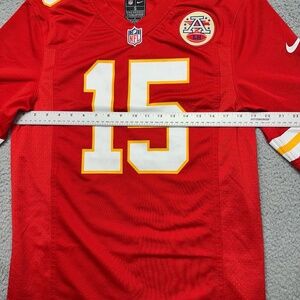 This Nike sports jersey features the iconic NFL Kansas City Chiefs styling with number 15 and official league logos. Its vibrant red color and classic short sleeve design make it perfect for Chiefs fans or collectors alike.