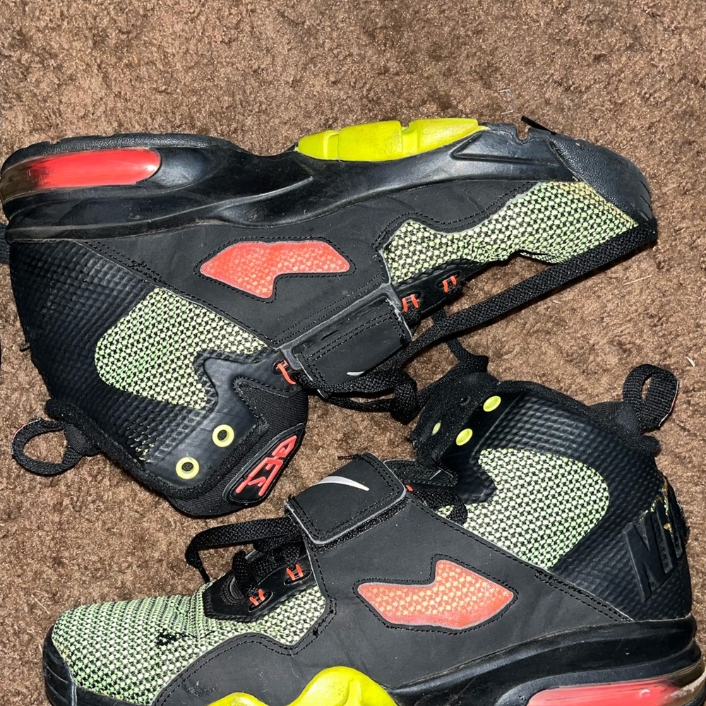 Bold Nike sneakers with black and neon green design. Features vibrant red accents. Ideal for sporty style.