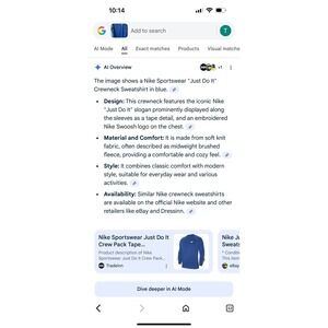 Nike pullover sweat shirt, excellent pre-owned condition! Chest 41"–44" 104–112 cm