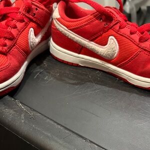 Vibrant red sneakers with white accents. Durable and stylish for active kids.