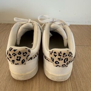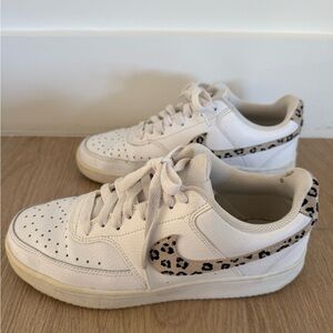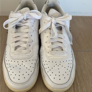 Classic white Nike sneakers with a bold black logo. Ideal for everyday style.