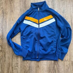 This classic Nike track jacket features a vibrant blue body with bold yellow and white chevron stripe detailing across the chest. Designed for a tailored athletic fit, it includes a mock neck collar and ribbed cuffs and hem for a secure feel.