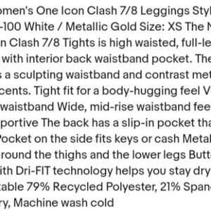 NWOT and no defects. Size medium white Nike leggings with black, grey and gold stripes. They have 2 hidden pockets in waistband. Flat waist 13" and inseam of 26". Very cute and retailed for $80. Price firm.