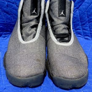 Gently worn kid's size 4Y Nike number 819851-010 Jordan Horizon Premium RL GG metallic silver/black that are missing one shoelace