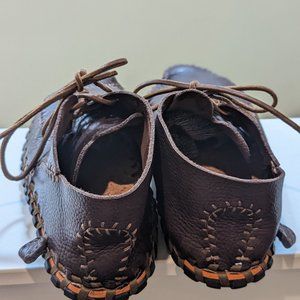 These are used but in marvelous shape for a shoe from the 90s. Gentle worn and well cared for. No cracks in the leather, rubber or cork. All stitching and webbing weave is tight and clean.