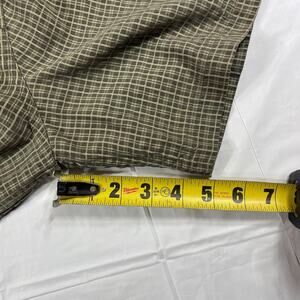 This Nike ACG Men’s Short Sleeve Button-Up Shirt in size XL is designed for outdoor comfort and versatility. Crafted from a lightweight blend of polynosic rayon and polyester, it provides a breathable and quick-drying feel, perfect for hiking, camping, or casual wear. The shirt features an olive green plaid pattern with dual zipper chest pockets and a classic collar design. Built for all-day comfort, this ACG shirt is ideal for outdoor adventures or everyday casual use.